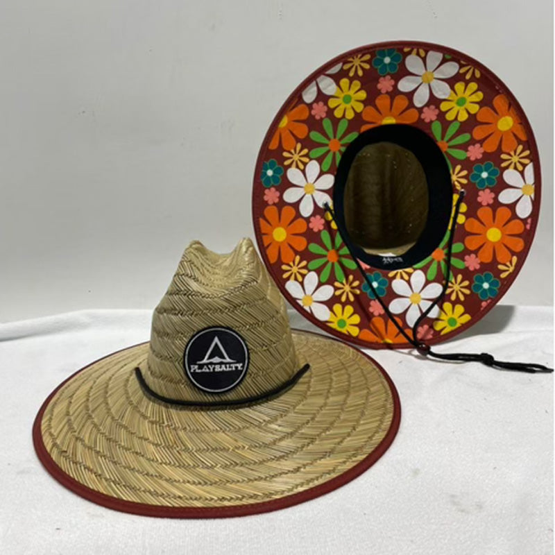 Made of straw, this wide brim features a woven Play Salty patch at the front, signature Play Salty designs printed on fabric at the underside, and adjustable toggle draw cord.