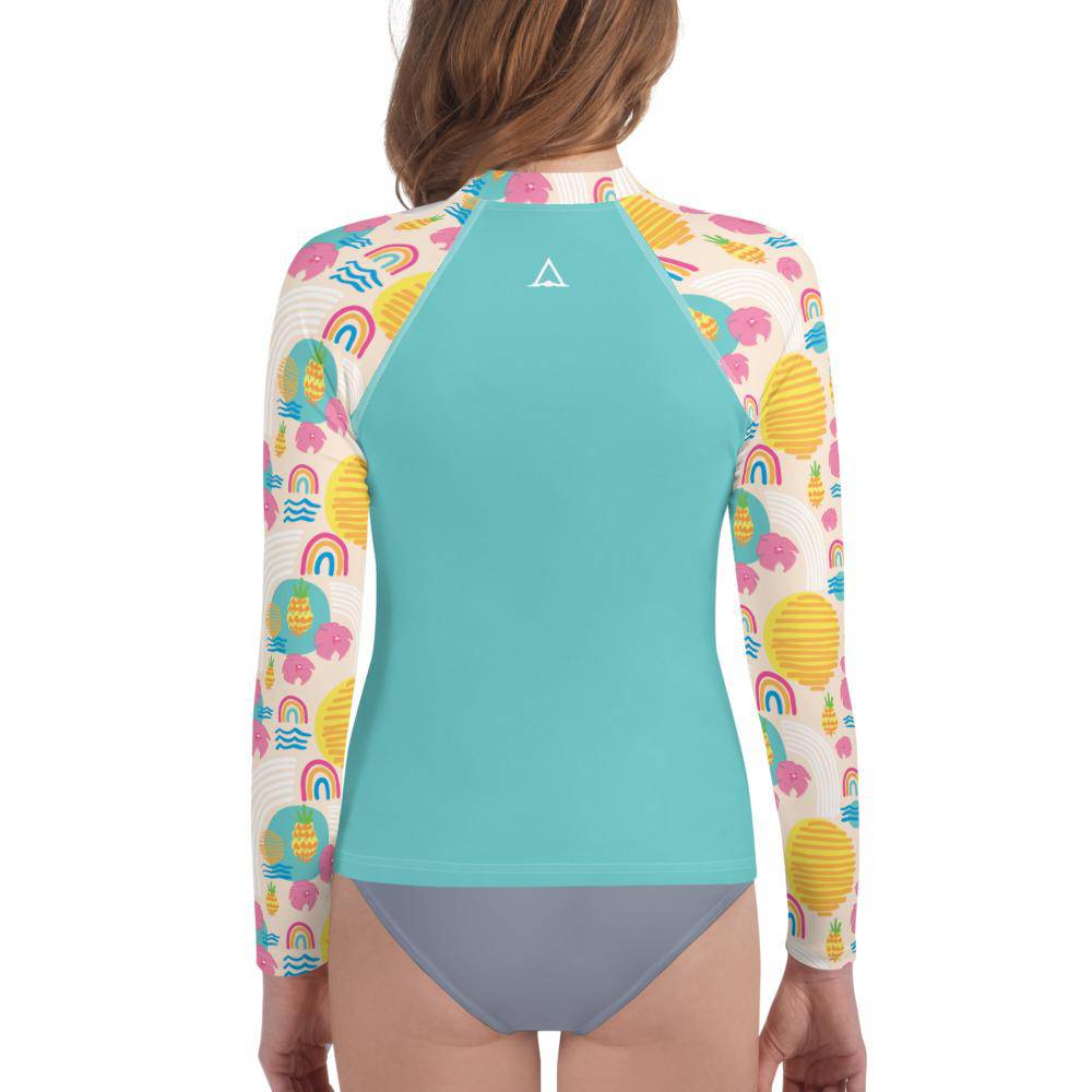 Get your teen / tween stoked in the water with this BEACH DAYS rash guard featuring a fun sunset, water, rainbows and flowers design. Weather you're playing on the sand, diving, surfing, SUPing or out on anything that floats, this rash guard has fun, beach day sun 38 - 40 UPF protection.