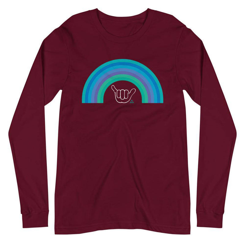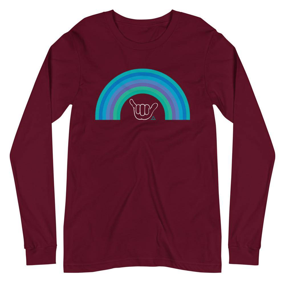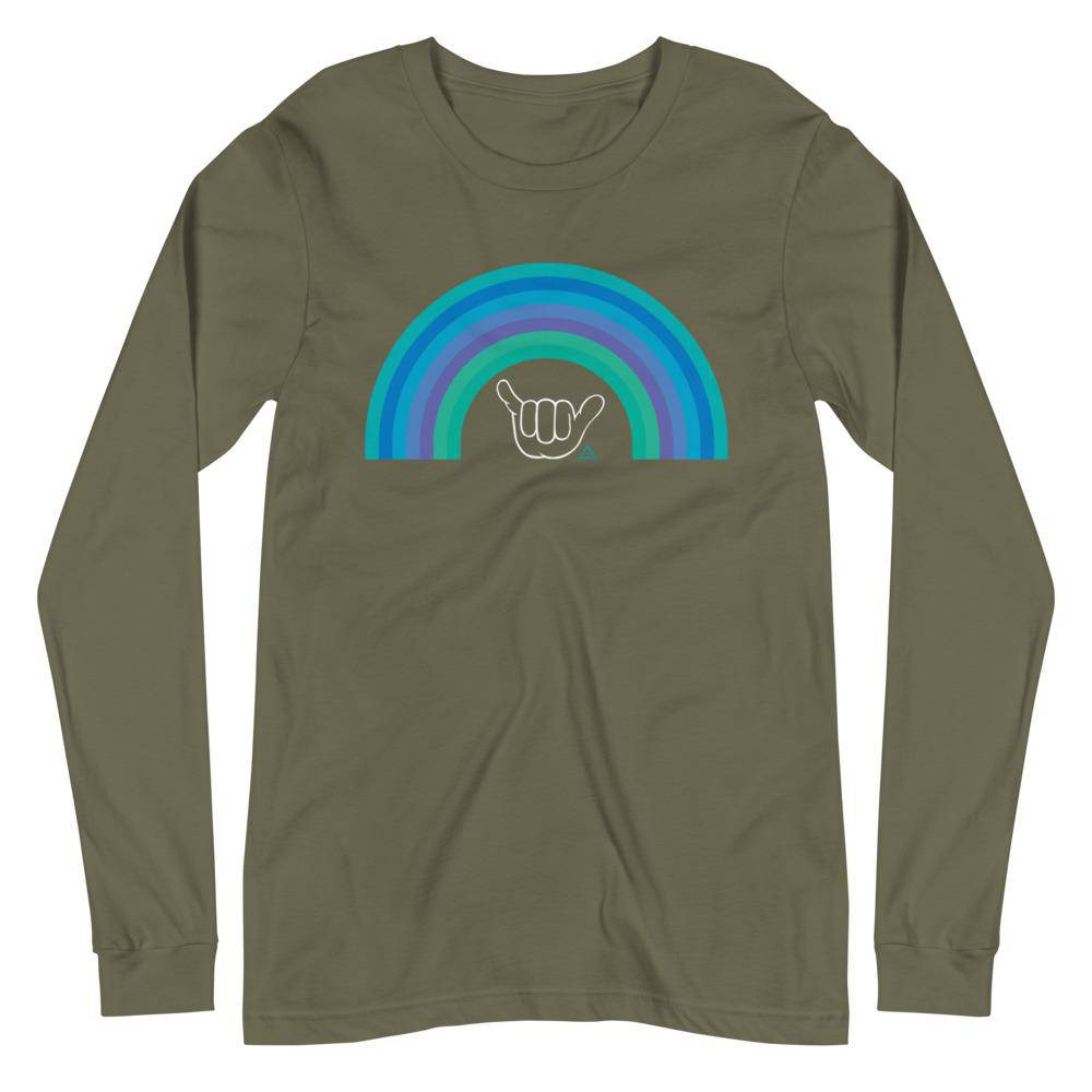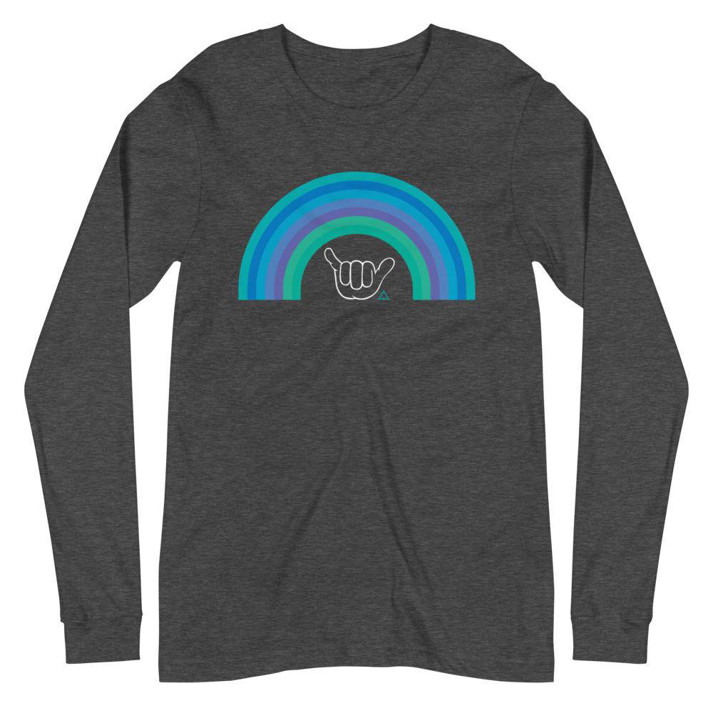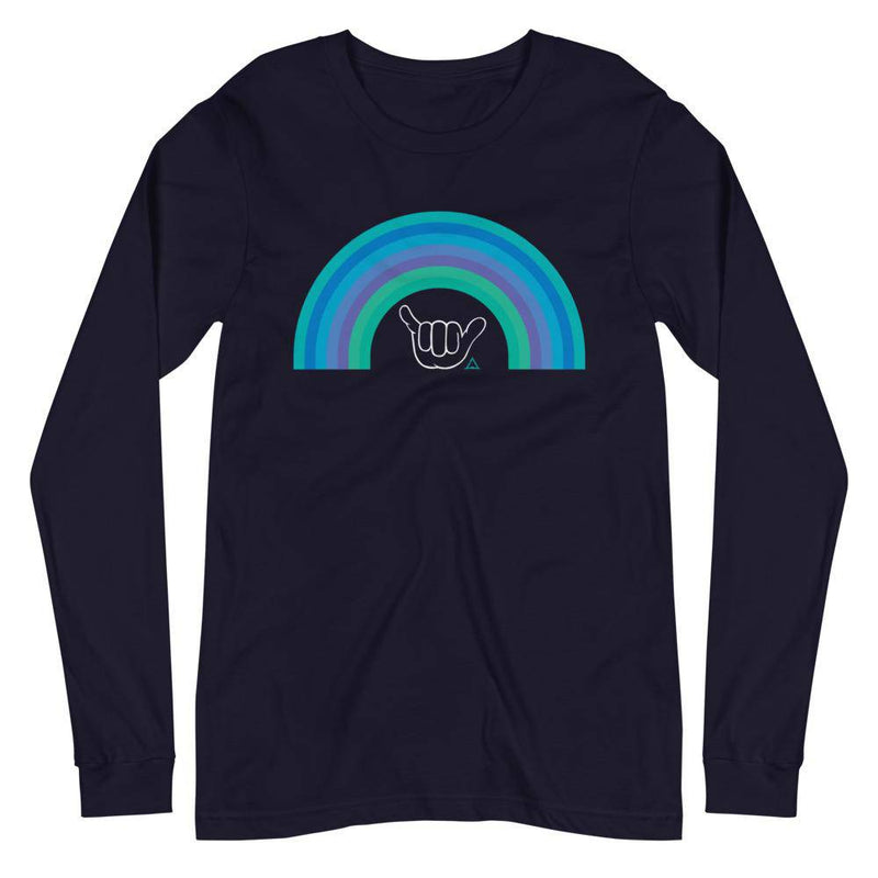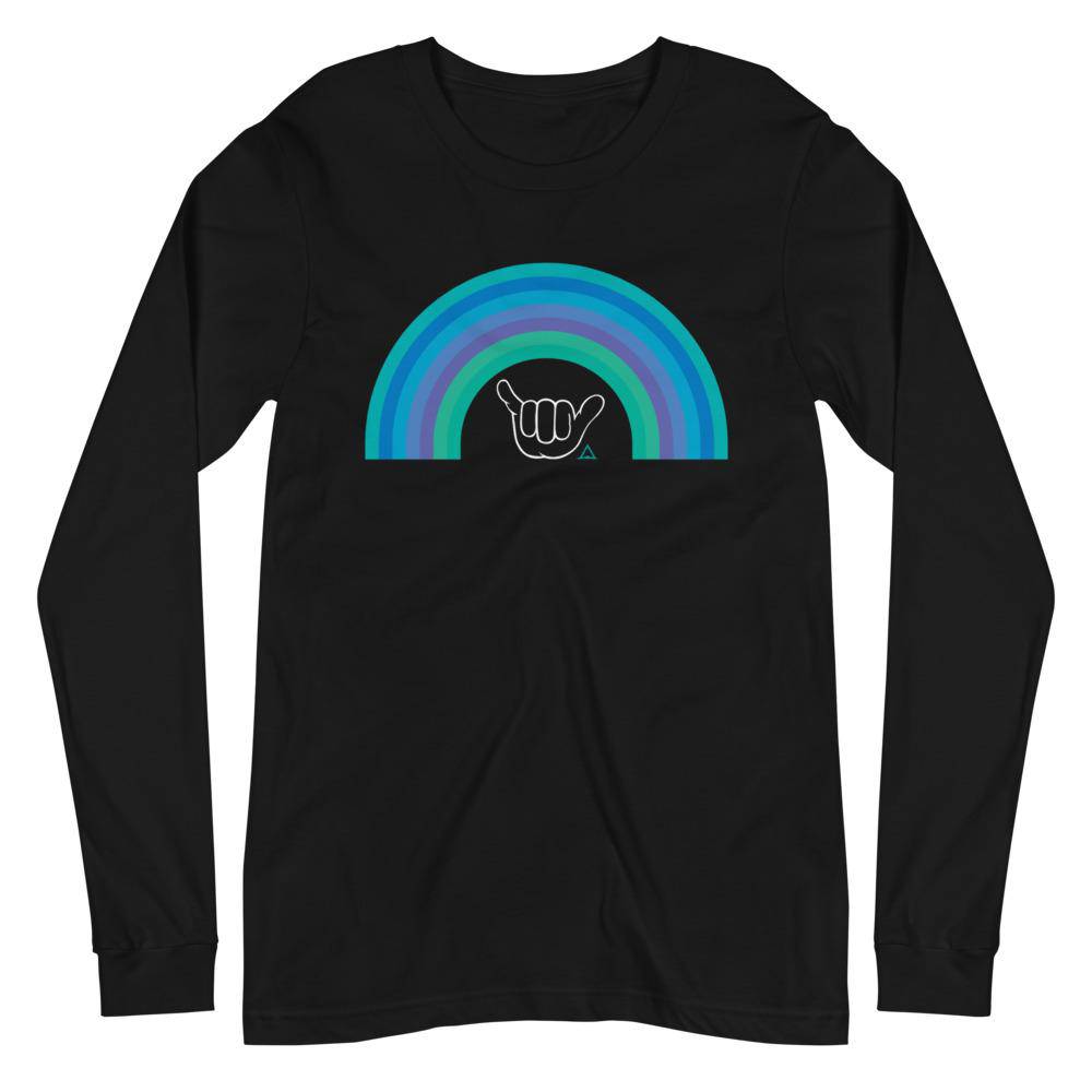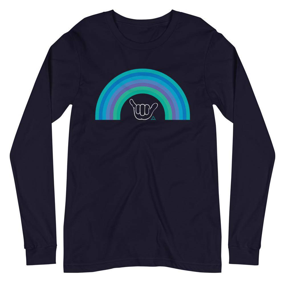 Polū in Hawaiian means Blue. Shaka, is the "Hang Loose" symbol of aloha. Mix that in with a Rainbow and you get the Shaka Polū Rainbow Eco Long Sleeve Tee.