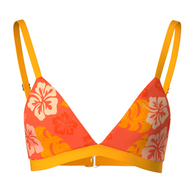 SUNKISSED HIBISCUS Reversible sporty bralette triangle style top. Features thicker shoulder straps for optimal support, especially for larger busts. REPREVE® recycled fabric with double lined fabric that's so comfortable, it feels like second skin! This sporty bikini top has a sports bra-like feel, making it perfect for any environment; surf, yoga, beach, volleyball, pool, SUP, boat or fun under the sun. Our Sunkissed Hibiscus bikini will keep you covered during any sporting activity.