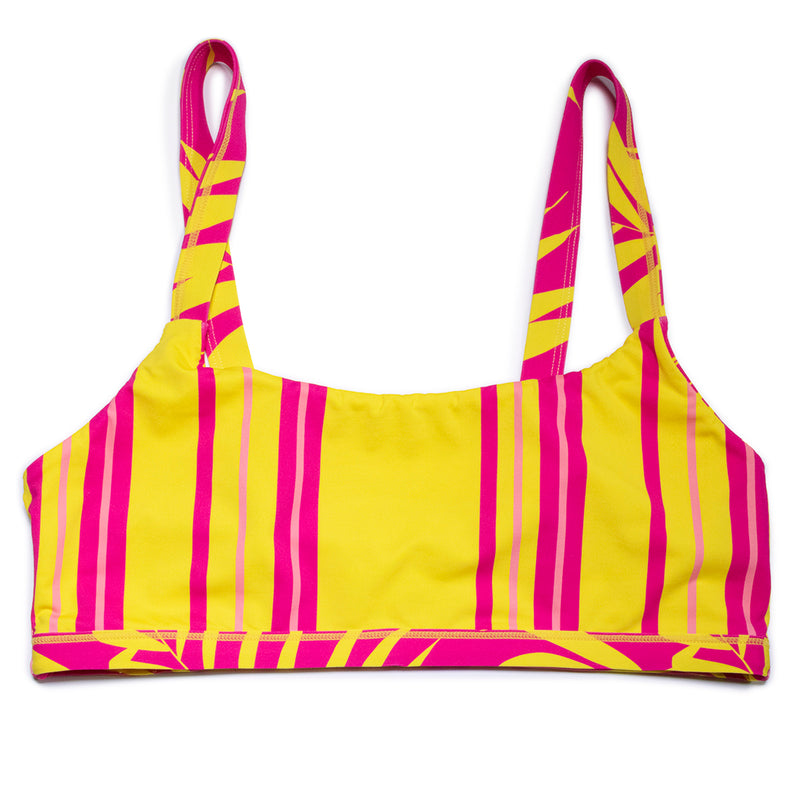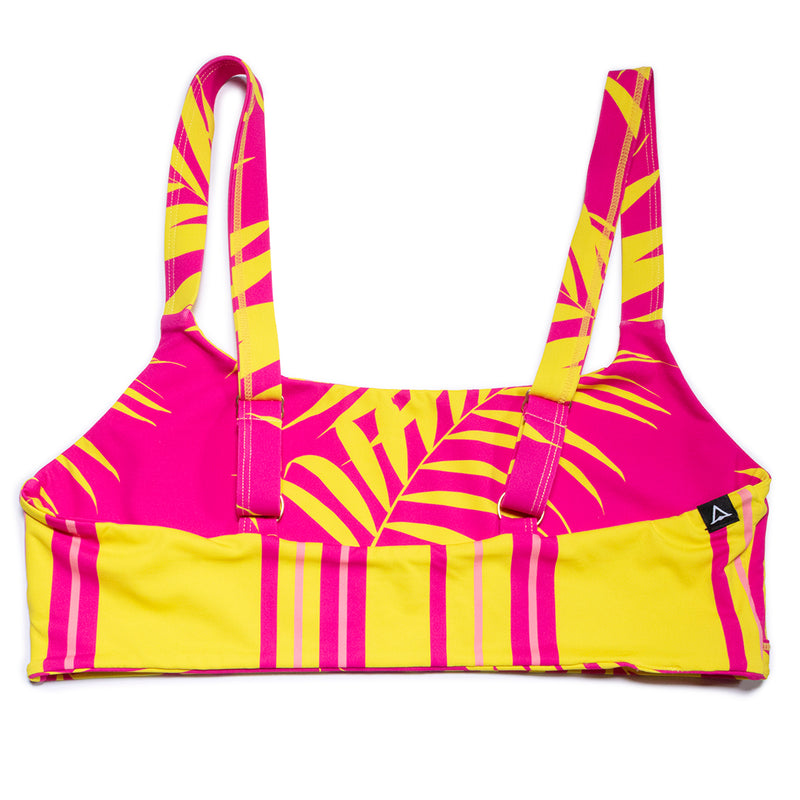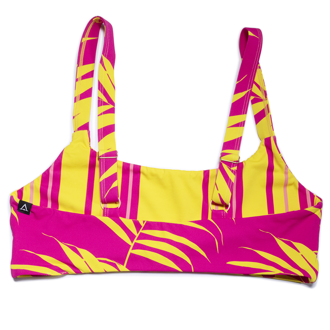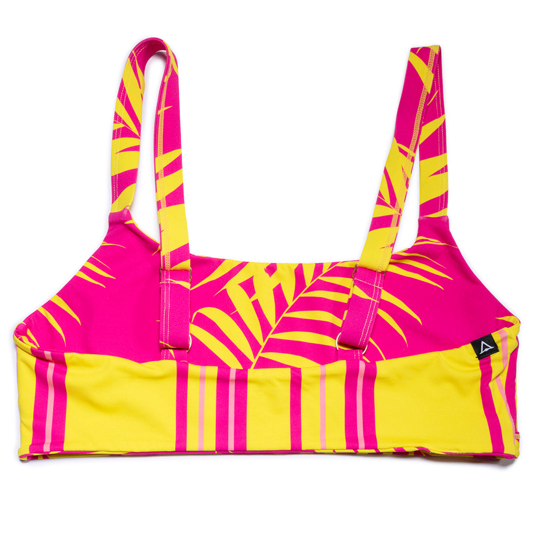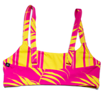 Vibrant ELECTRIC PINK PALMS sporty bikini top! Features thicker shoulder straps for optimal support, especially for larger busts. REPREVE® recycled fabric with double lined fabric that's so comfortable, it feels like second skin! This sporty bikini top has a sports bra-like feel, making it perfect for any environment; surf, yoga, beach, volleyball, pool, SUP, boat or fun under the sun. Our Electric Pink Palms bikini will keep you covered during any sporting activity.