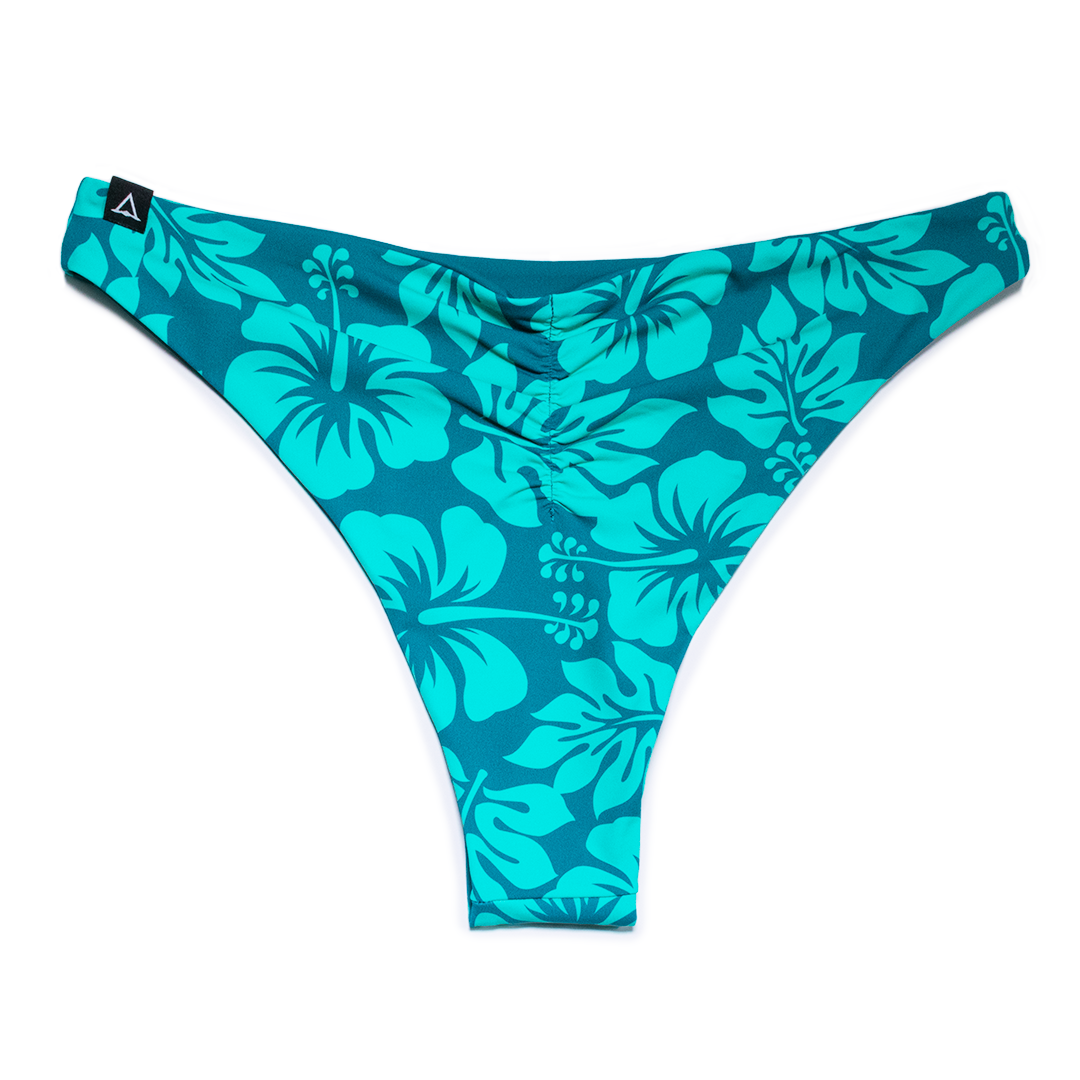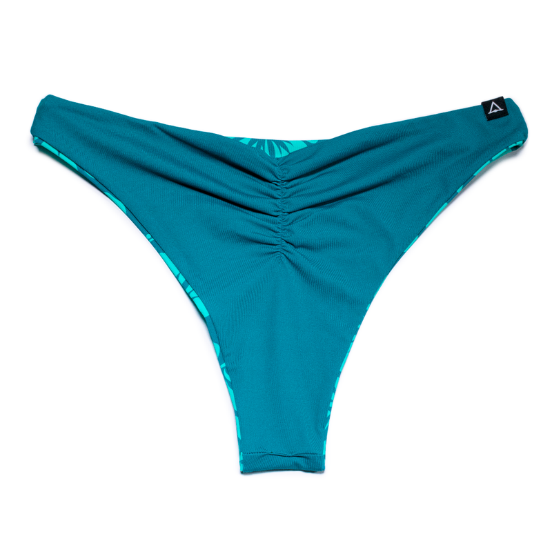 TEAL HIBISCUS reversible cheeky bikini bottom with all-around clean seams making it perfect for all-day wear on the sand, in the ocean or surf. REPREVE® recycled fabric, double-lined material designed with coverage in all the right places. Low rise waist, ruching on center back. Go ahead and show off those cheeky buns!