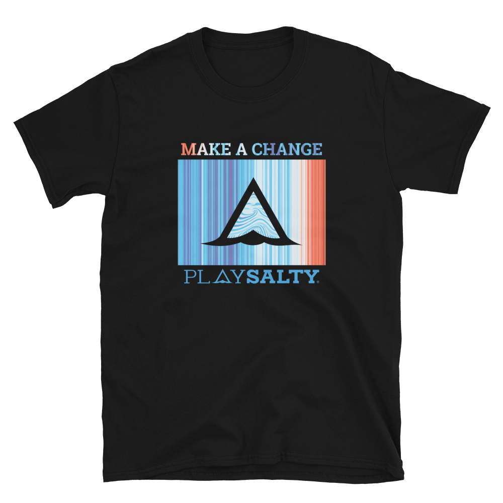 Our Make a Change tee shows the warming stripes to support a good cause and create awareness on climate change. It's made of a thicker, heavier cotton, but it's still soft and comfy. And the double stitching on the neckline and sleeves add more durability to what is sure to be a favorite!